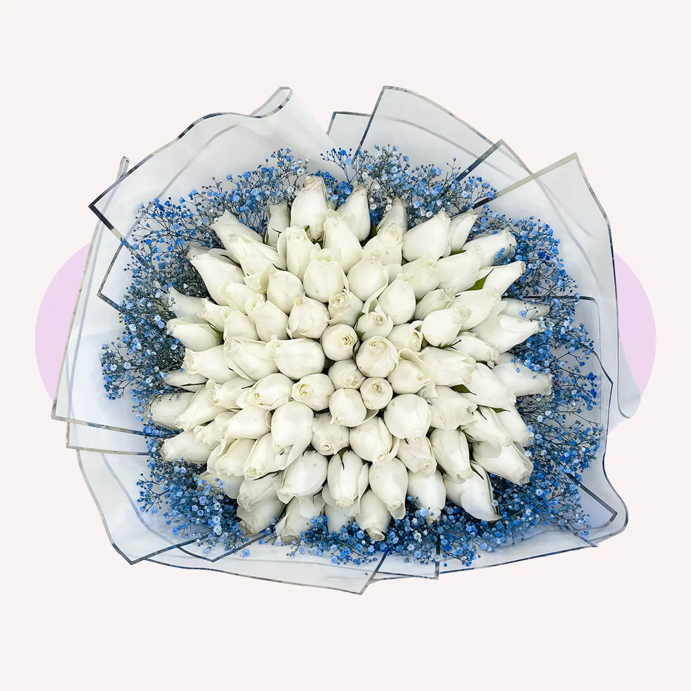 El bouquet 100 ROSAS BLANCAS CON GYPSO AZUL es un diseño imponente y elegante, ideal para sorprender con una combinación única y sofisticada.