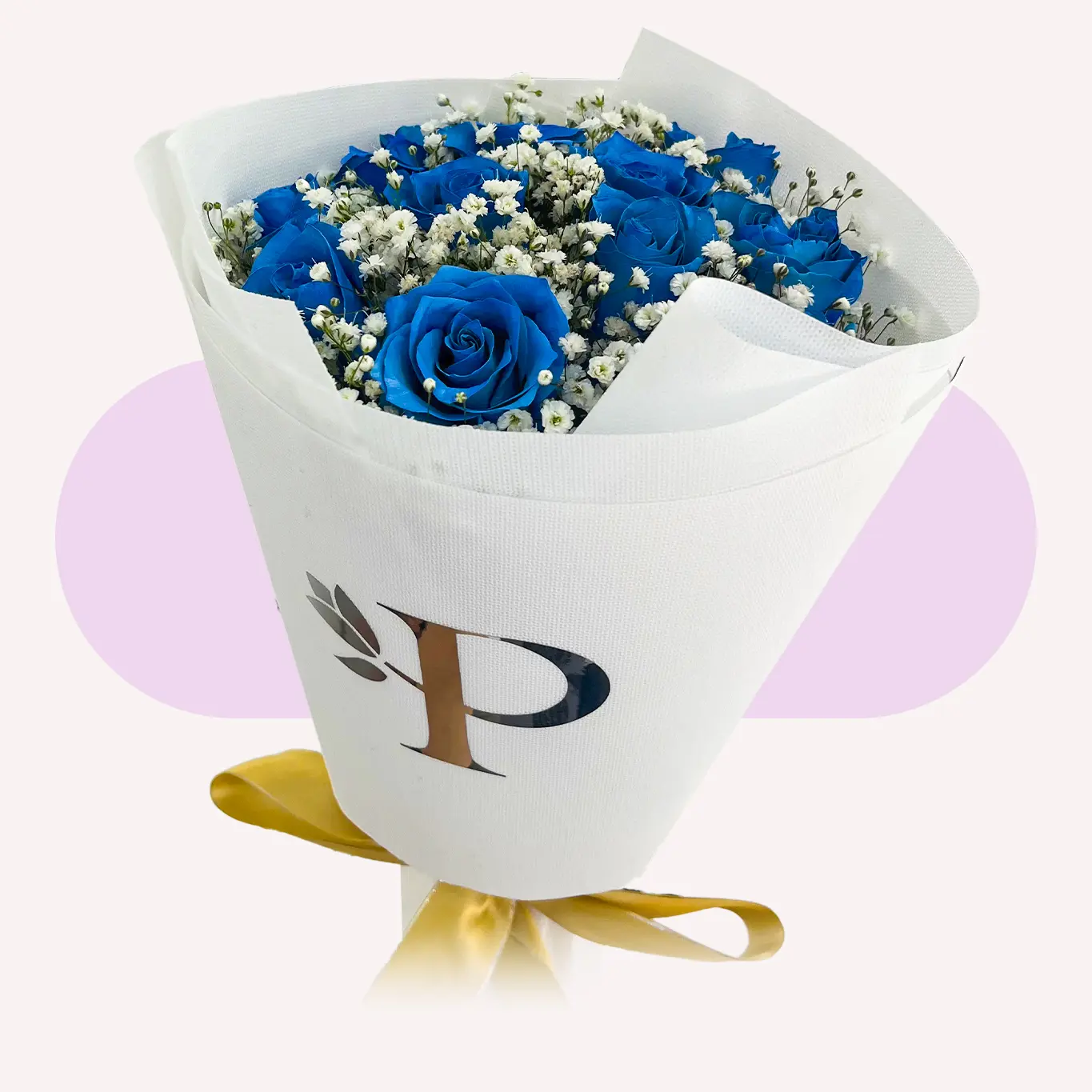 El bouquet 12 ROSAS AZULES CON GYPSO es un detalle único y moderno, ideal para sorprender con algo diferente y especial.