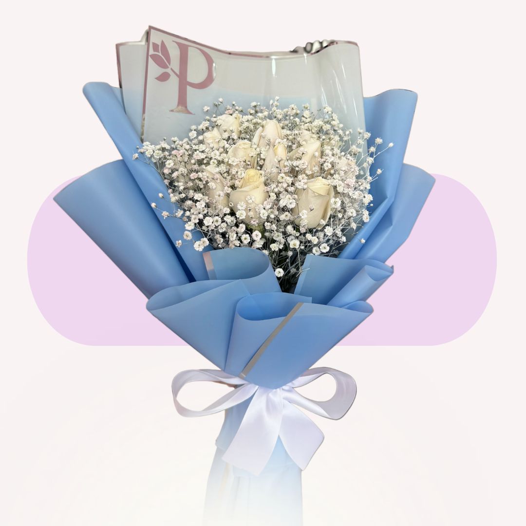 El bouquet 12 ROSAS BLANCAS CON GYPSO PLATINUM es un detalle elegante y sofisticado, ideal para expresar respeto y buen gusto.