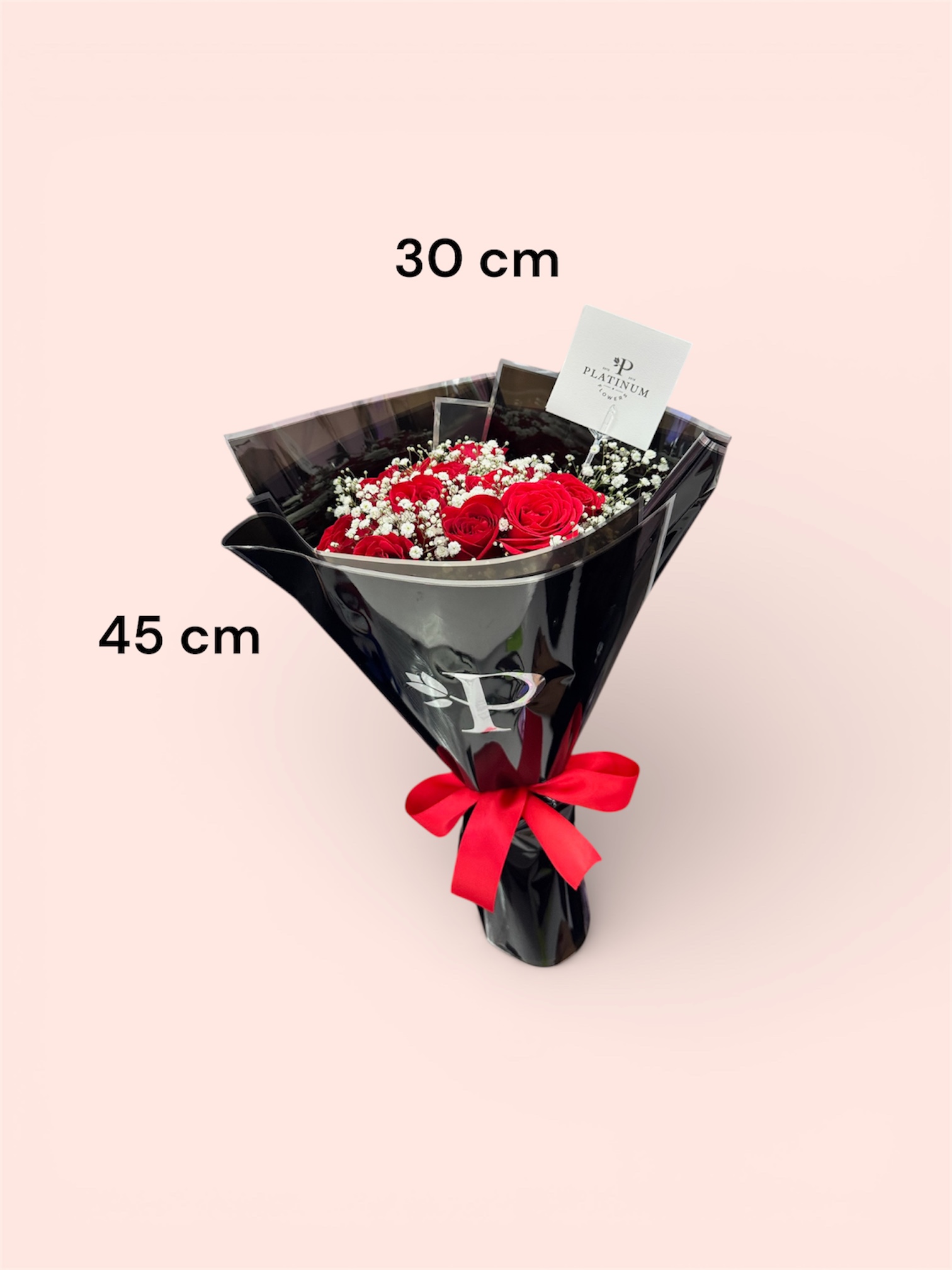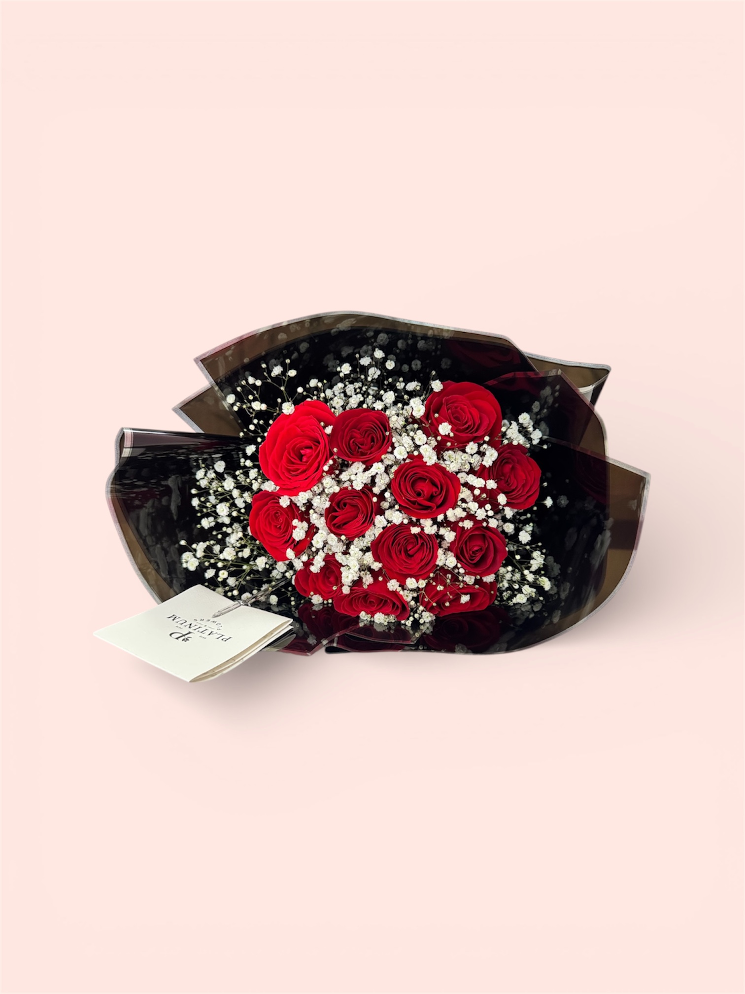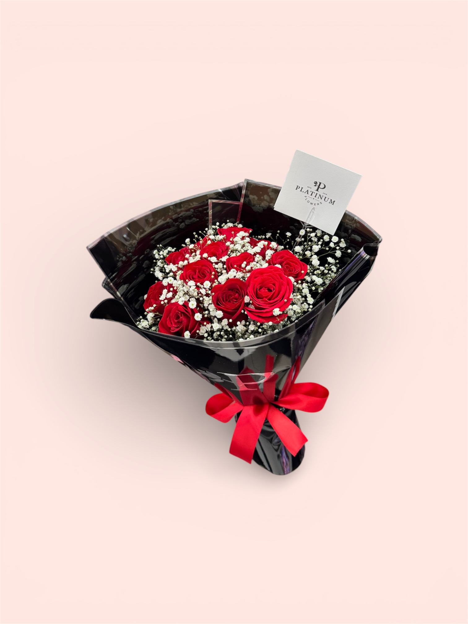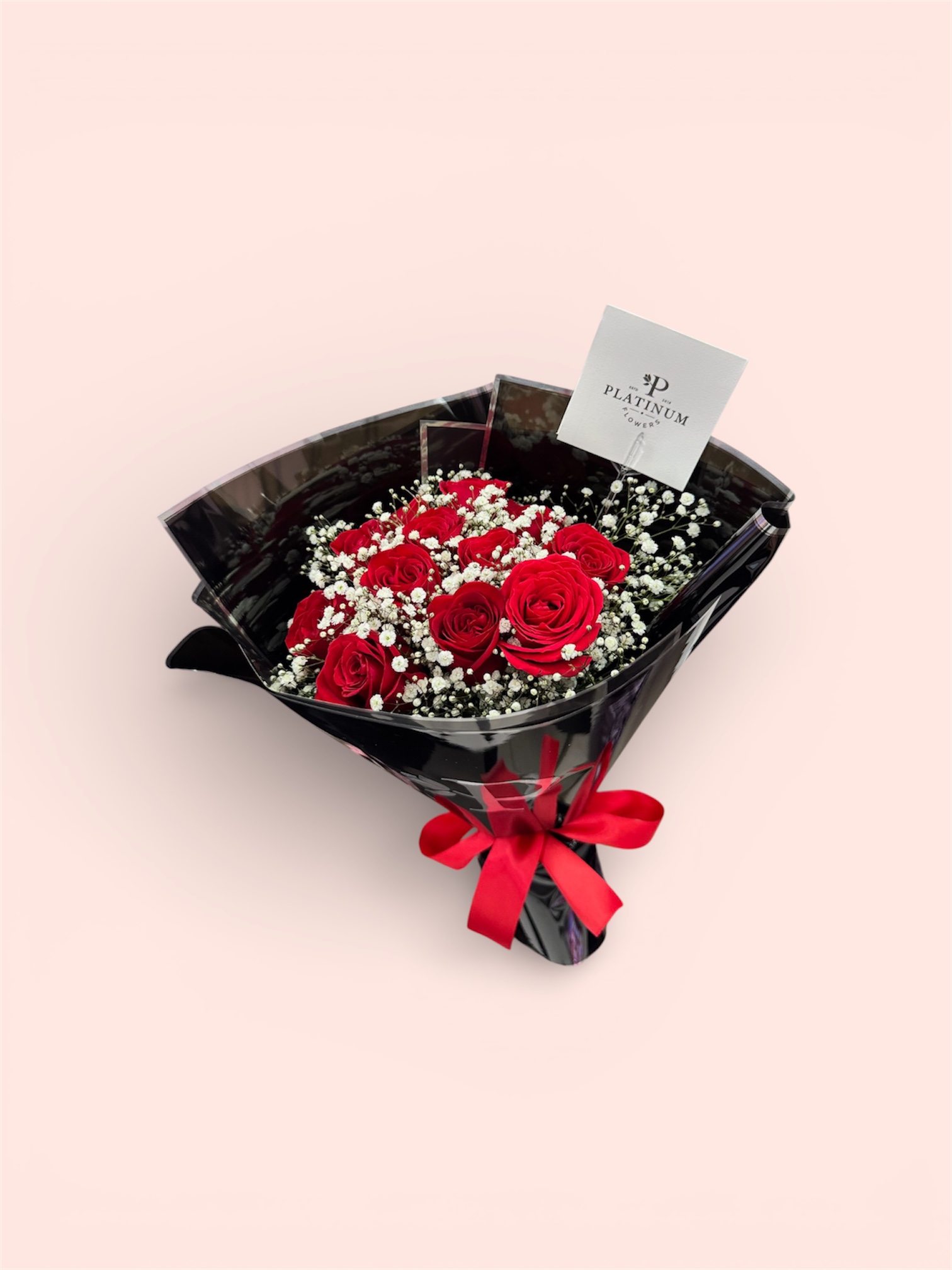 La combinación de rosas rojas con gypso crea un diseño limpio y sofisticado con el sello distintivo de Platinum Flowers.