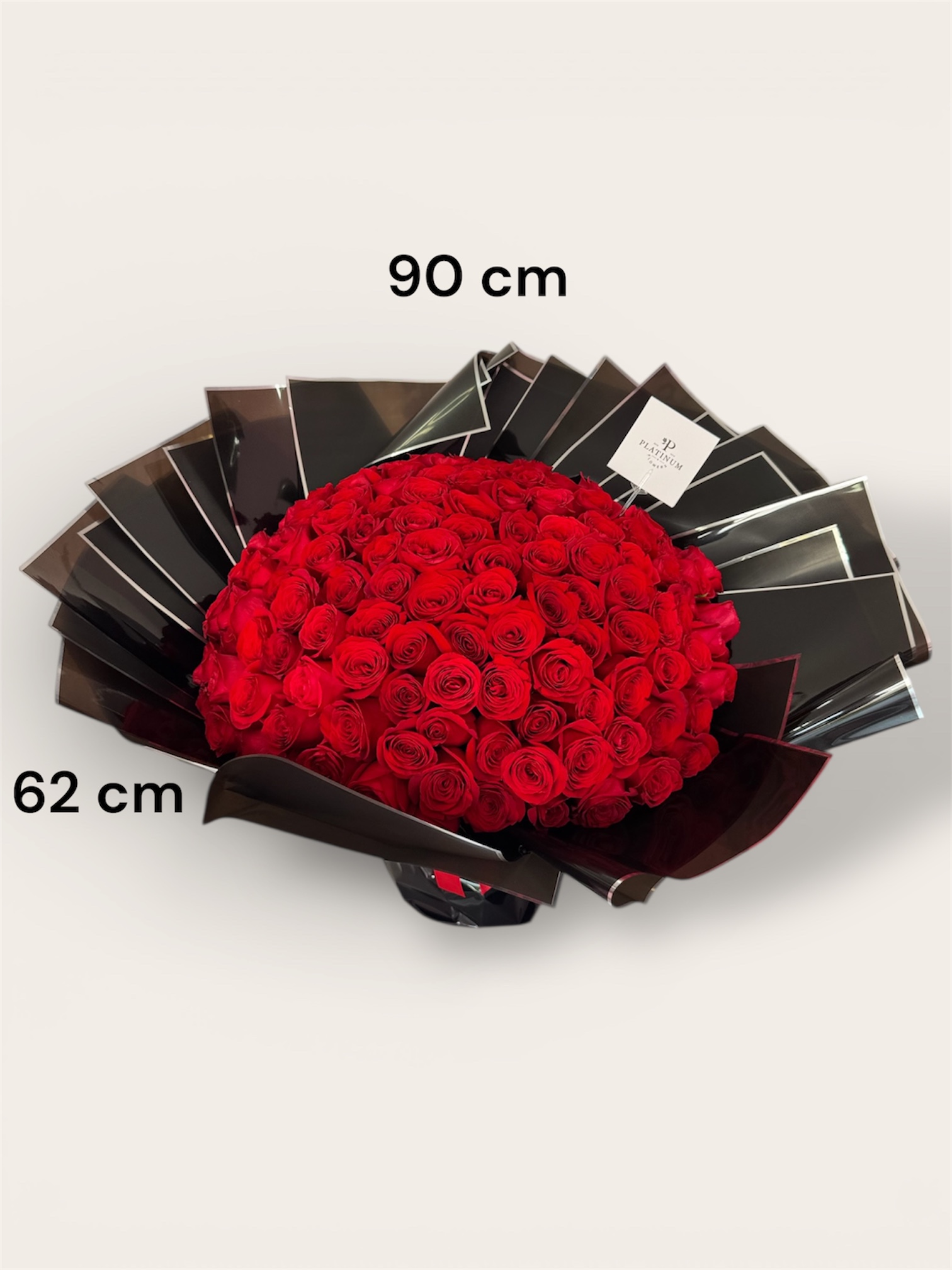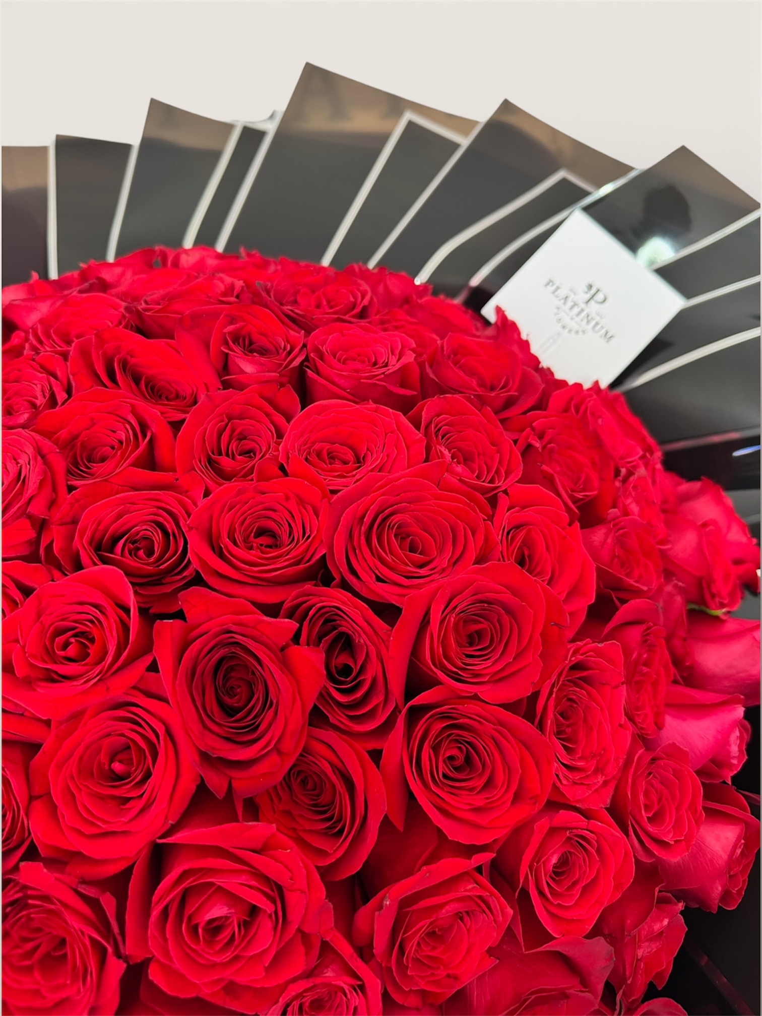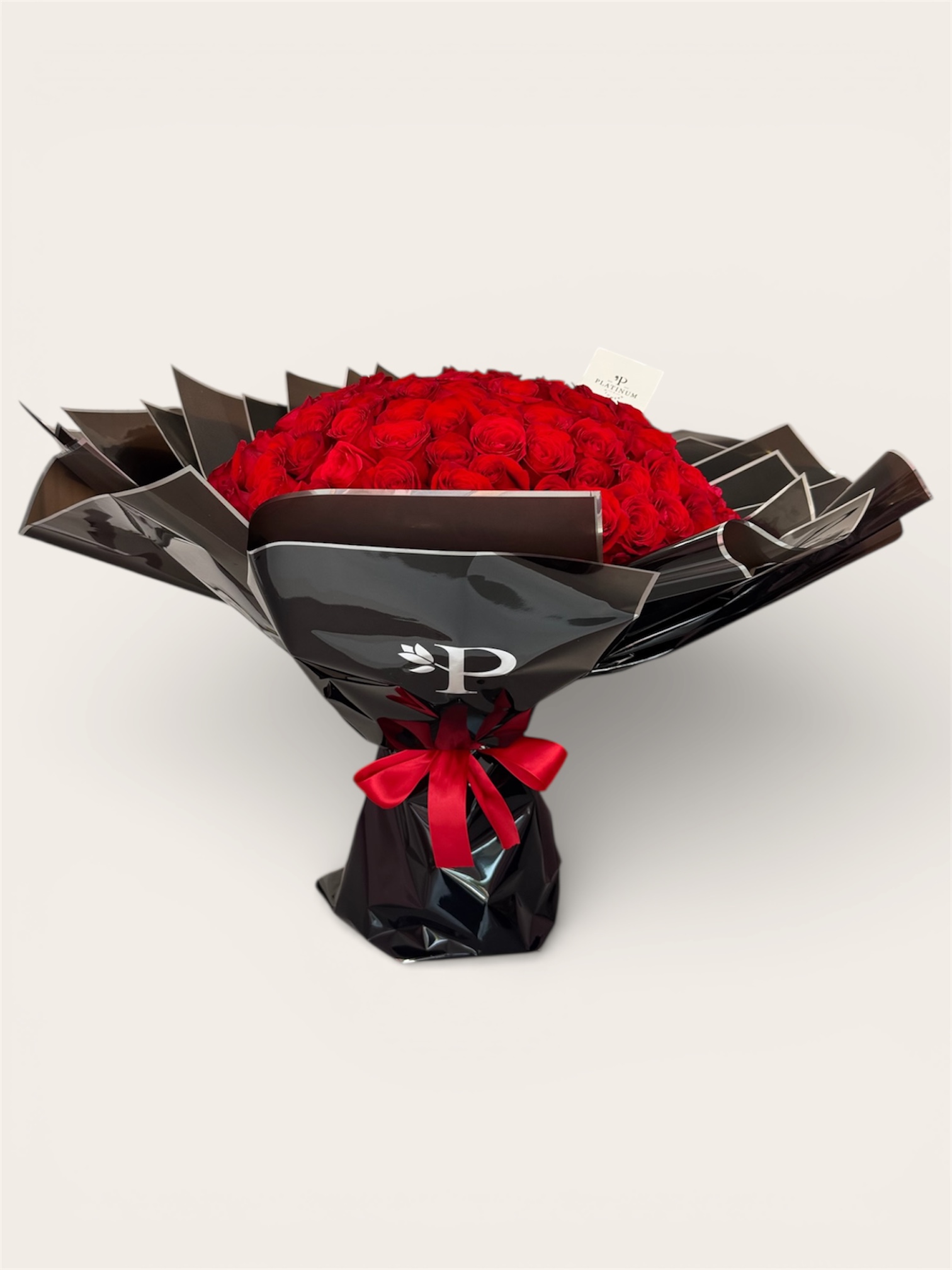 Sus rosas rojas crean un diseño majestuoso y elegante, elaborado con el sello distintivo de Platinum Flowers.