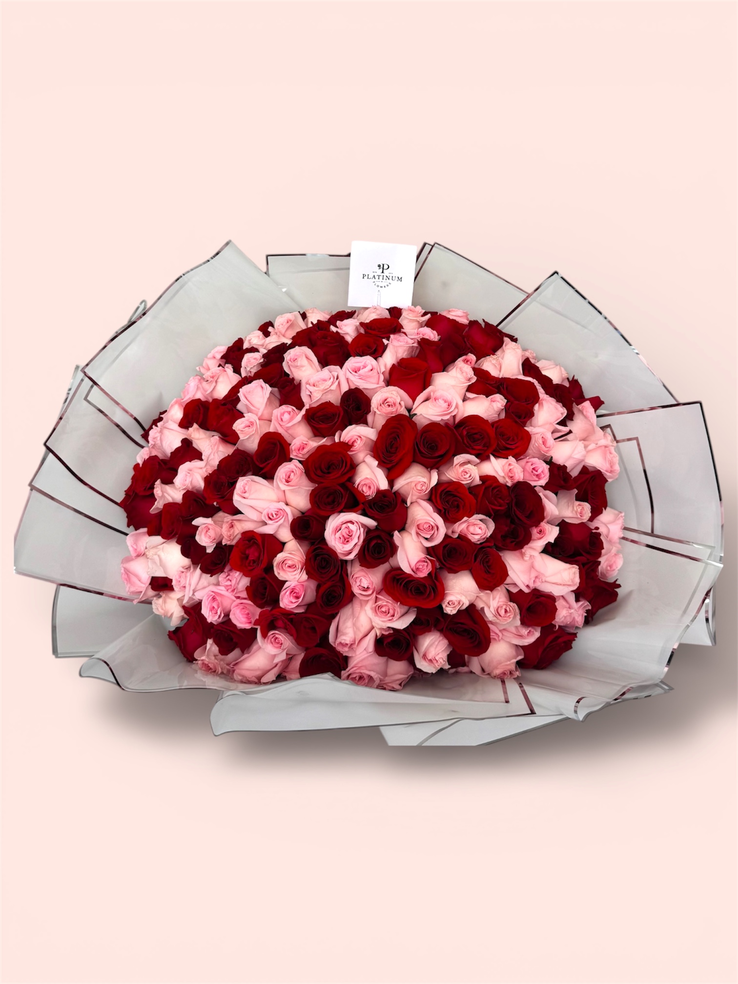 La mezcla de rosas en distintos tonos crea un bouquet amplio, vibrante y armonioso, con gran volumen y el sello Platinum Flowers.