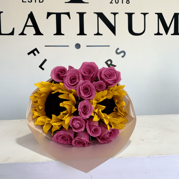 El bouquet 8 ROSAS ROSAS Y 2 GIRASOLES es un diseño alegre y equilibrado, ideal para regalar un detalle lleno de color y frescura.