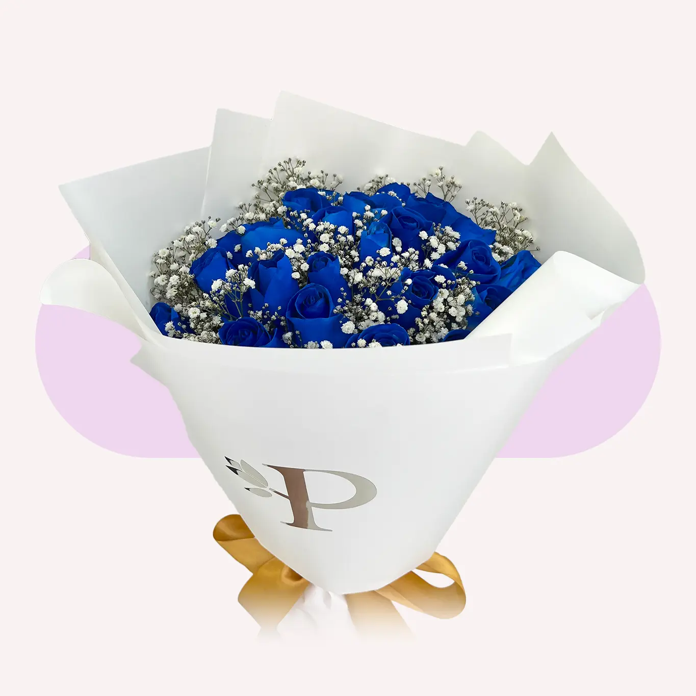 La combinación de rosas azules con gypso crea un arreglo llamativo y equilibrado, elaborado con el estilo característico de Platinum Flowers.