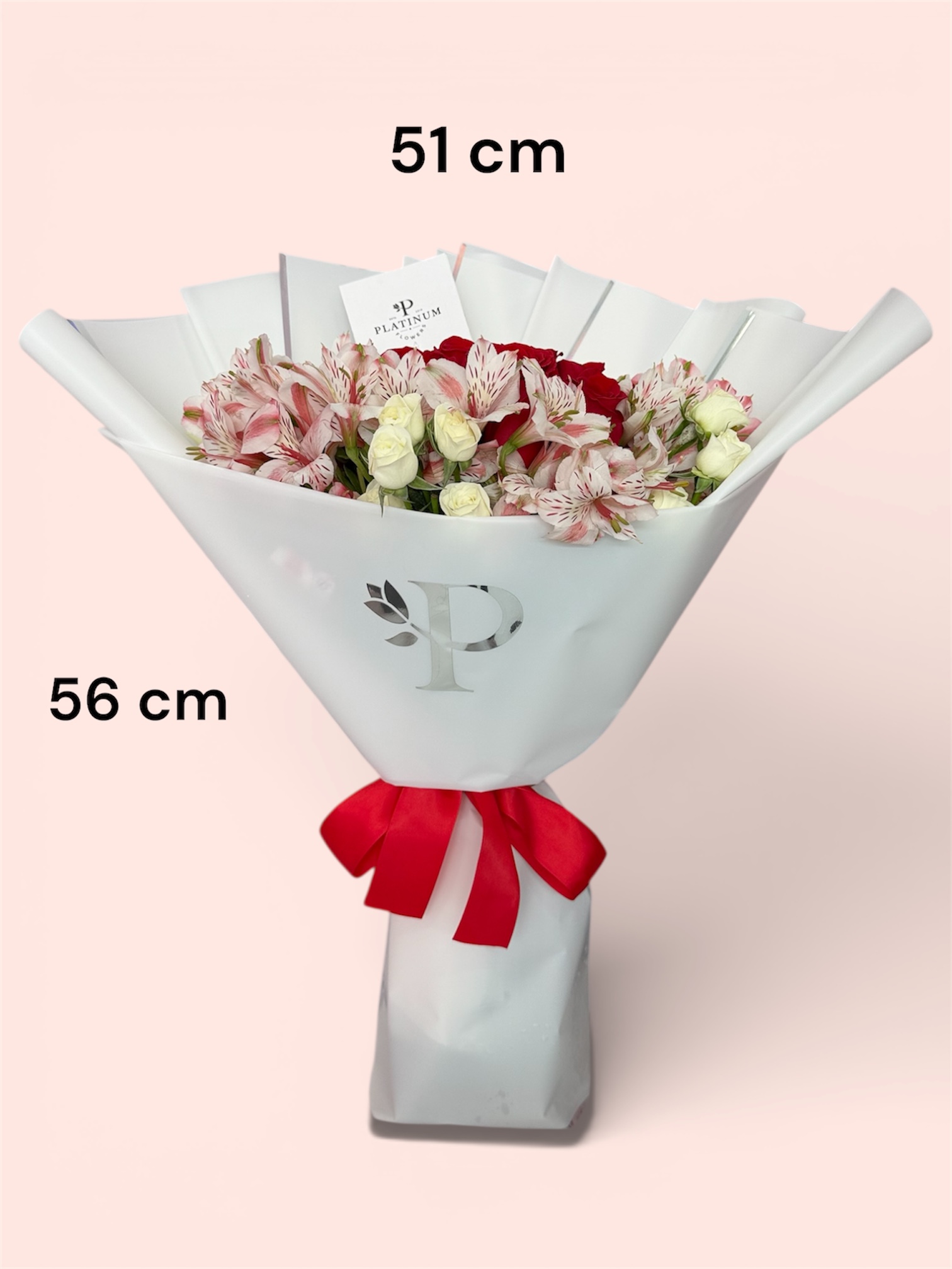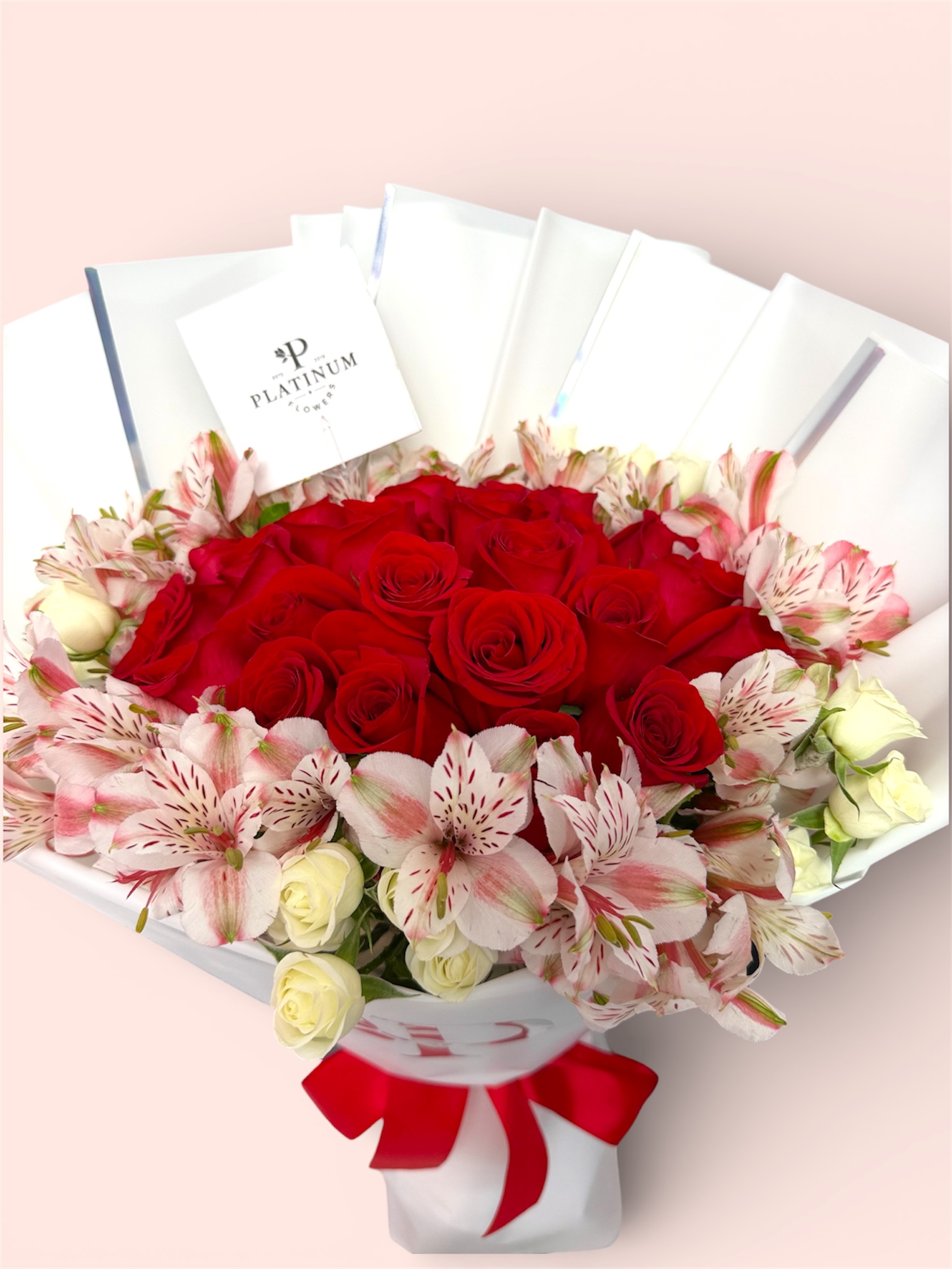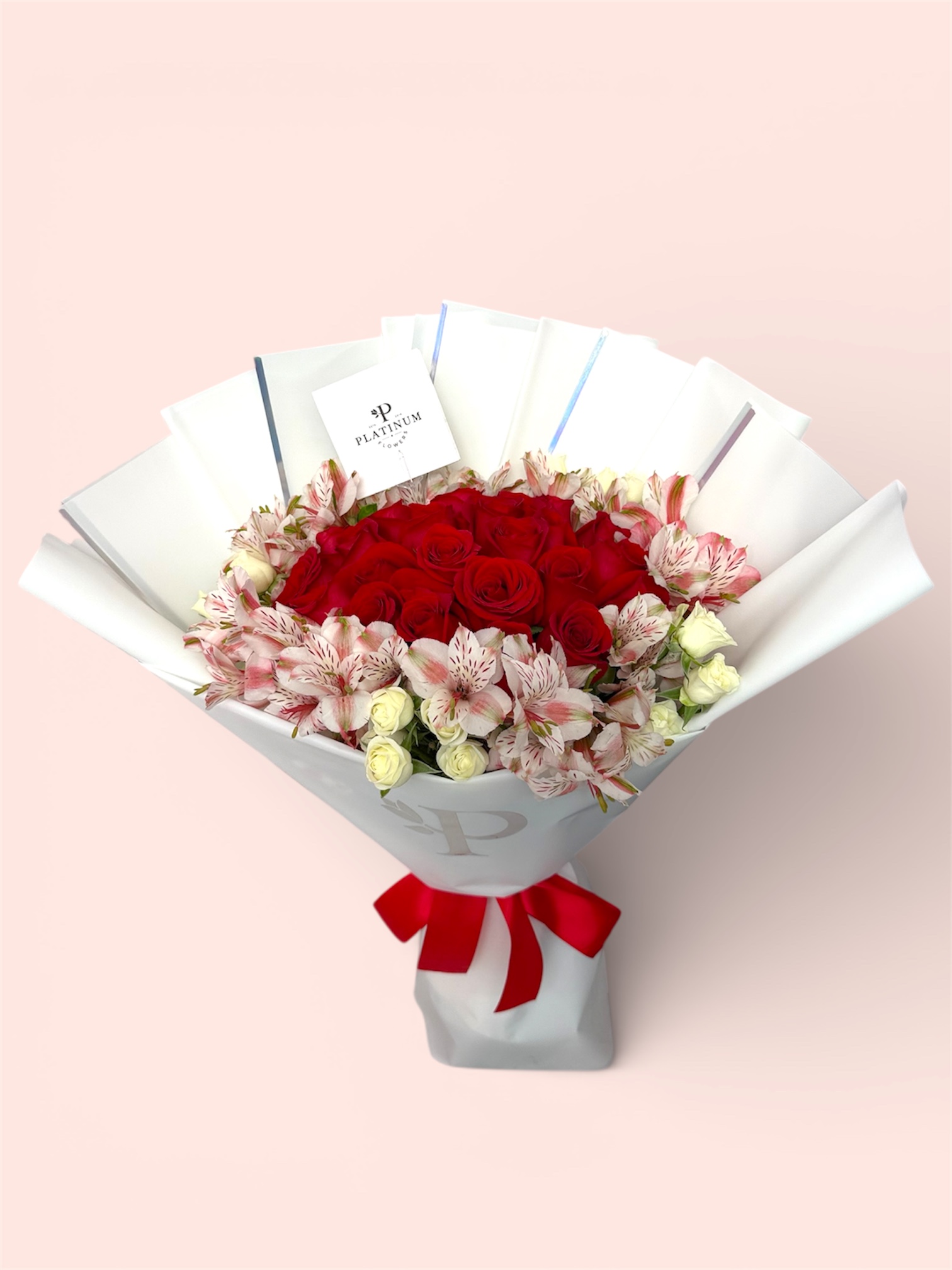 Combina rosas rojas con astromelia y mini rosa, logrando un diseño equilibrado y vistoso, elaborado con el estilo característico de Platinum Flowers.