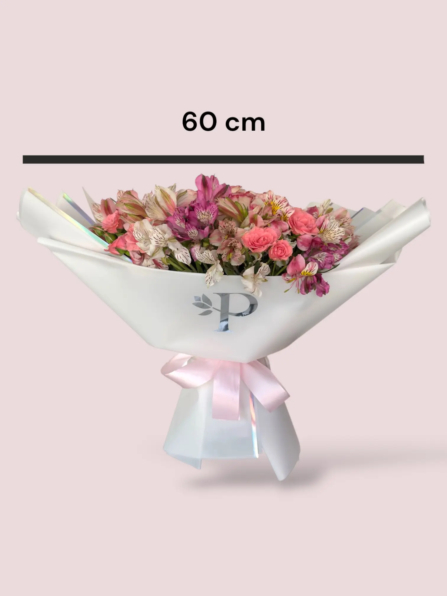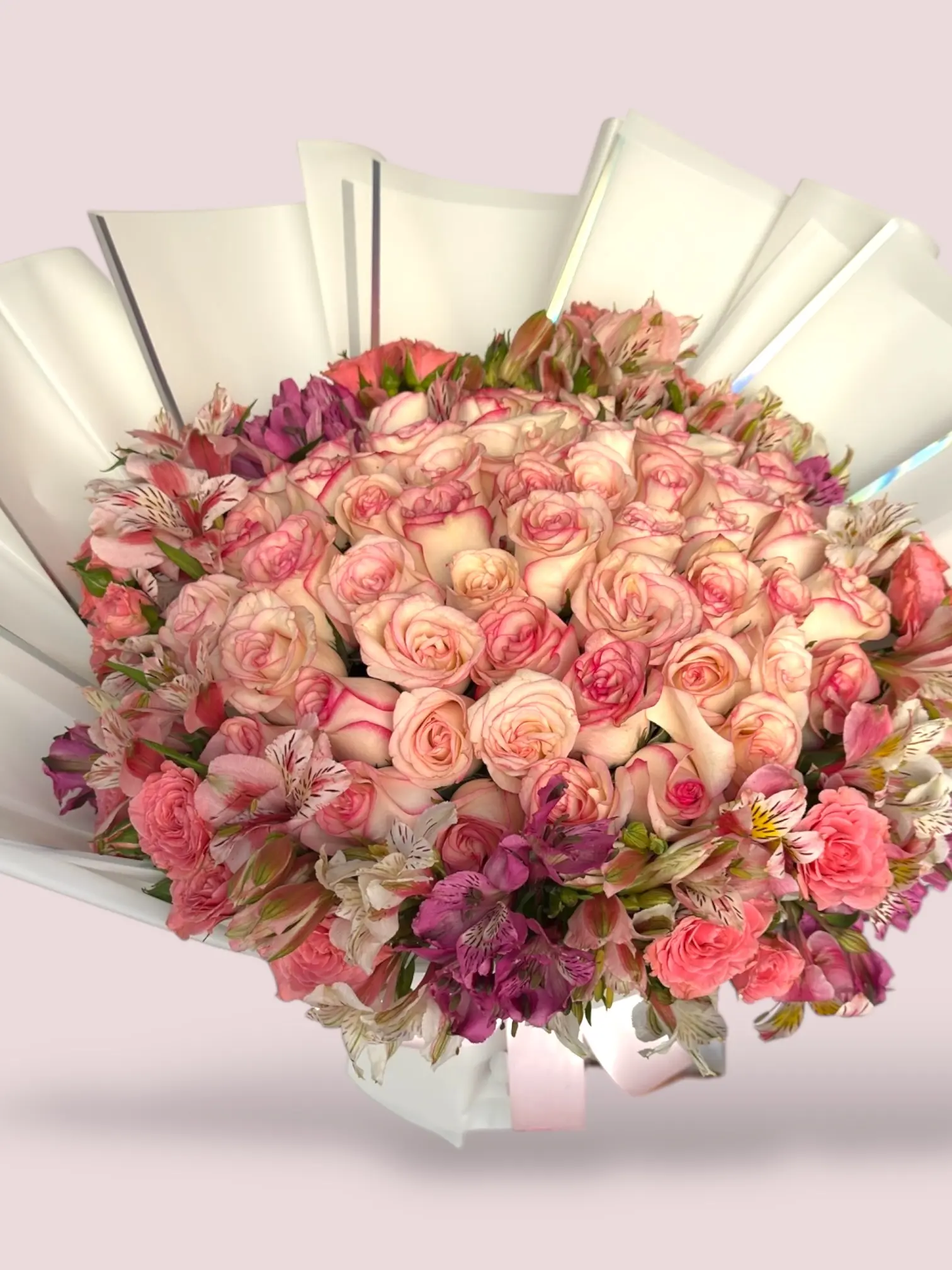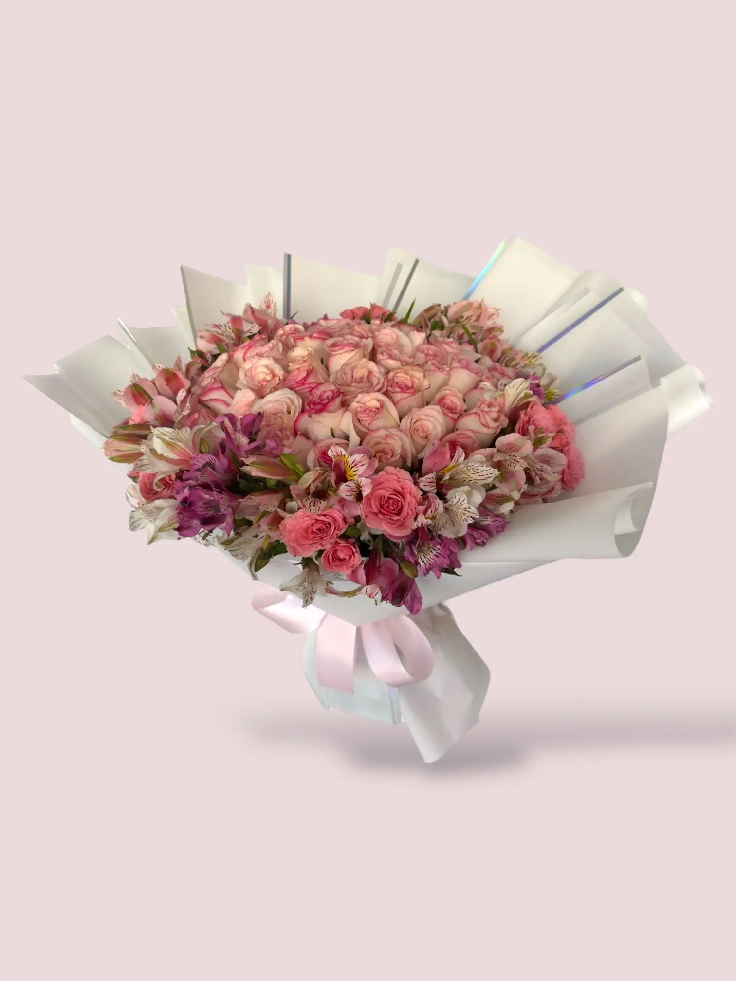 La combinación de rosas Dovela con astromelia y mini rosa aporta textura y volumen, logrando un bouquet equilibrado y vistoso con el sello distintivo de Platinum Flowers.