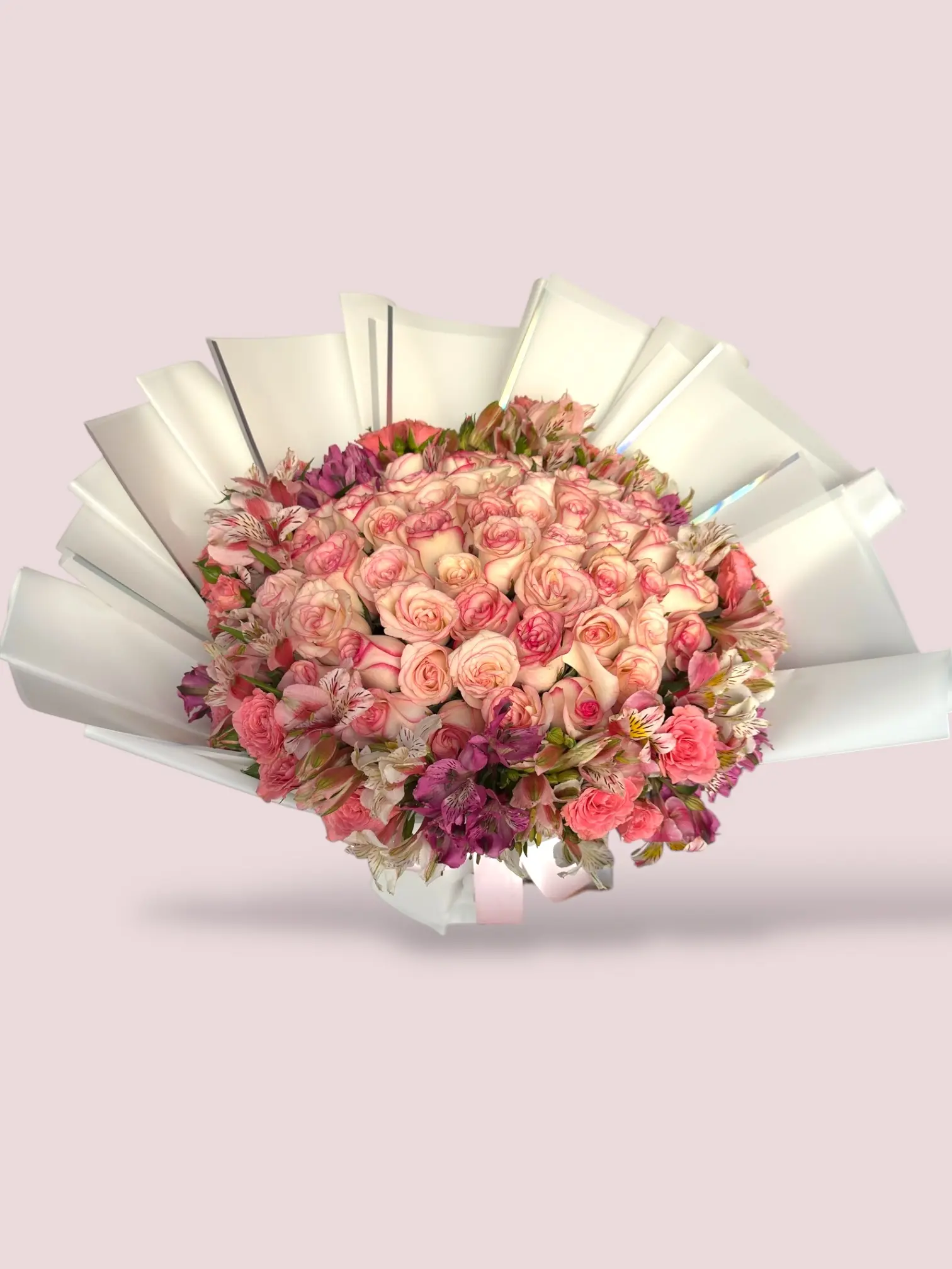 El bouquet 50 ROSAS DOVELA CON ASTROMELIA Y MINI ROSA es un detalle sofisticado y de gran impacto visual, ideal para sorprender con elegancia.
