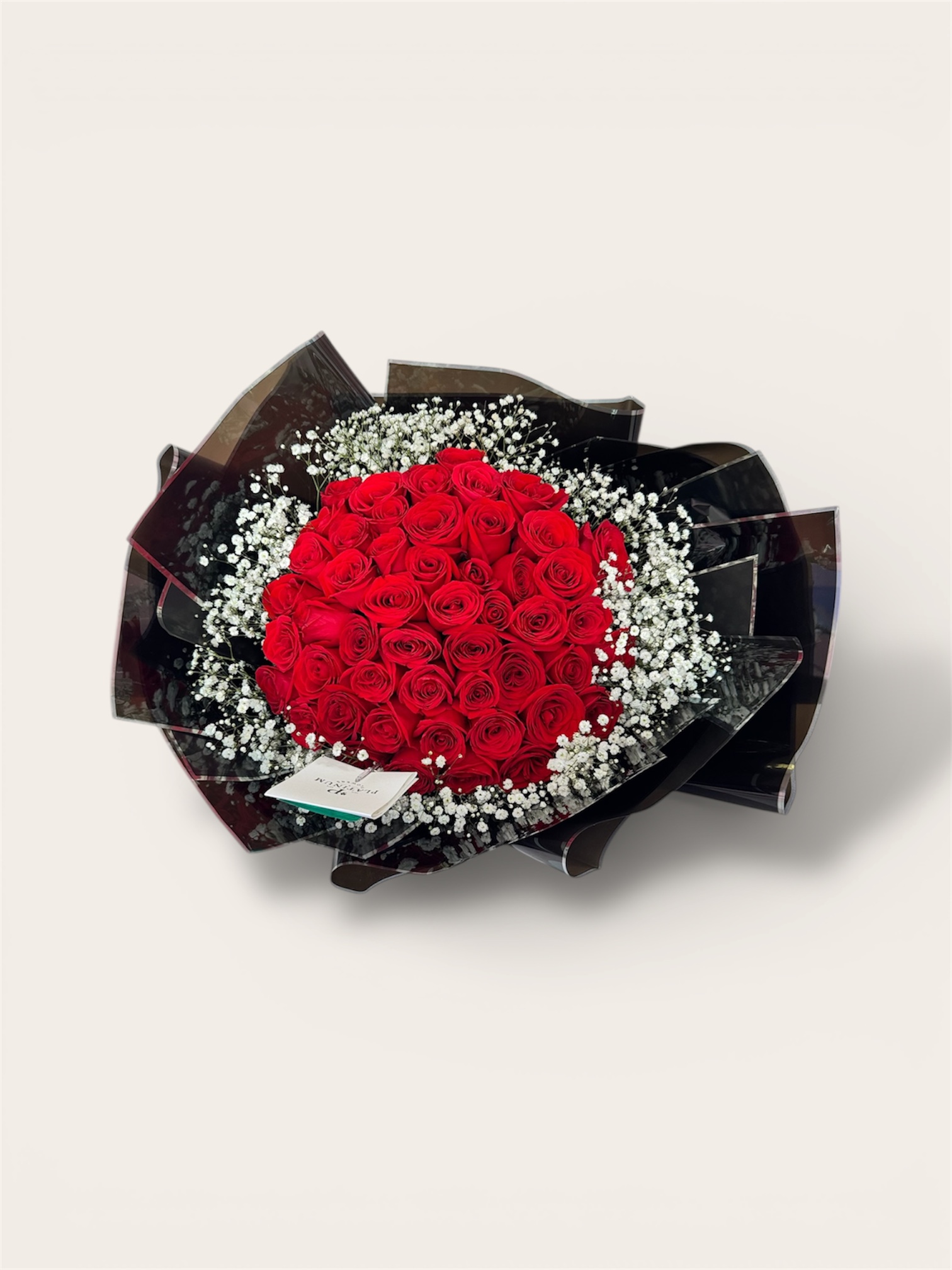 El bouquet 50 ROSAS ROJAS CON GYPSO es un clásico elegante y de gran presencia, ideal para expresar amor y admiración en grande.