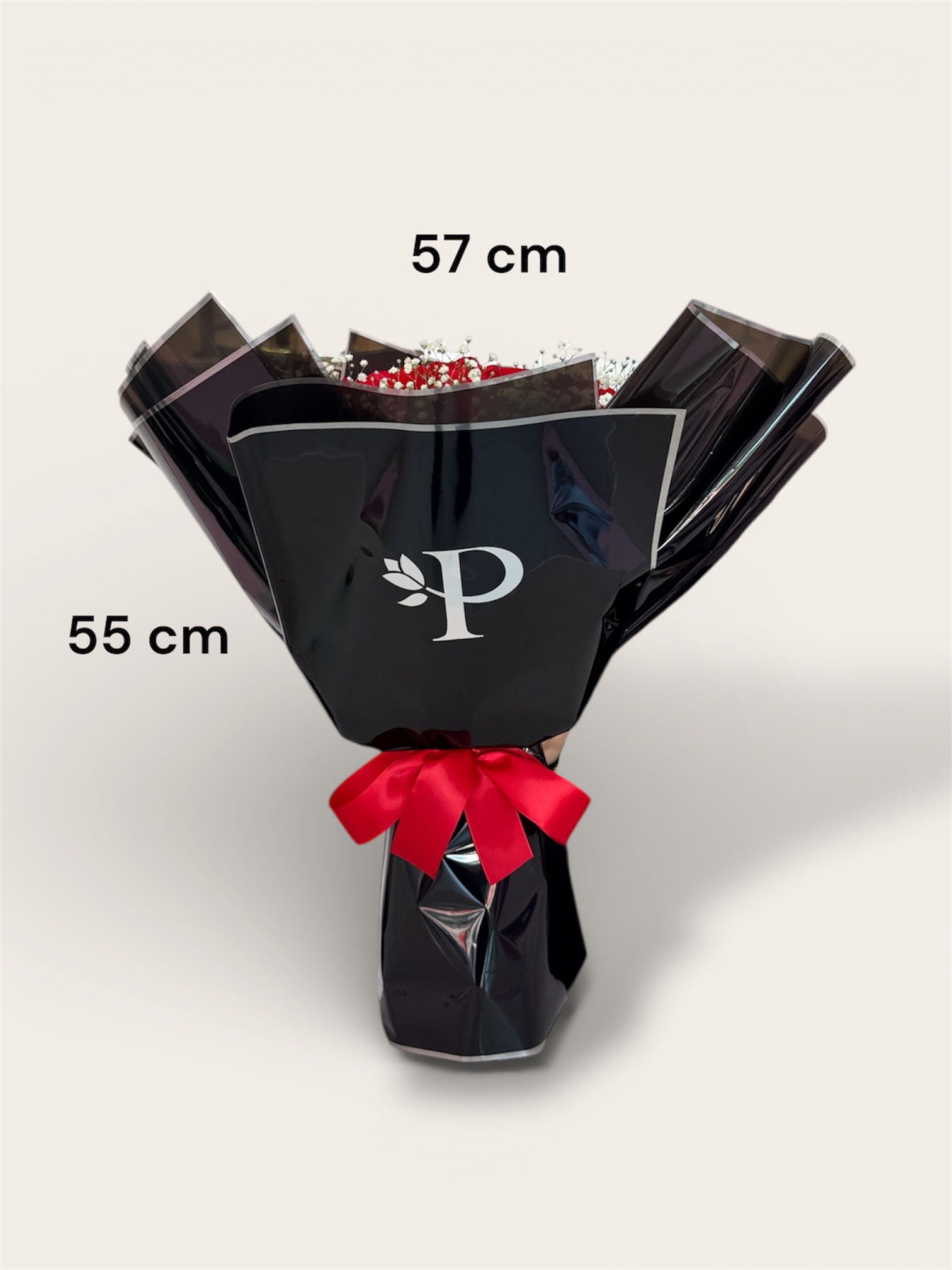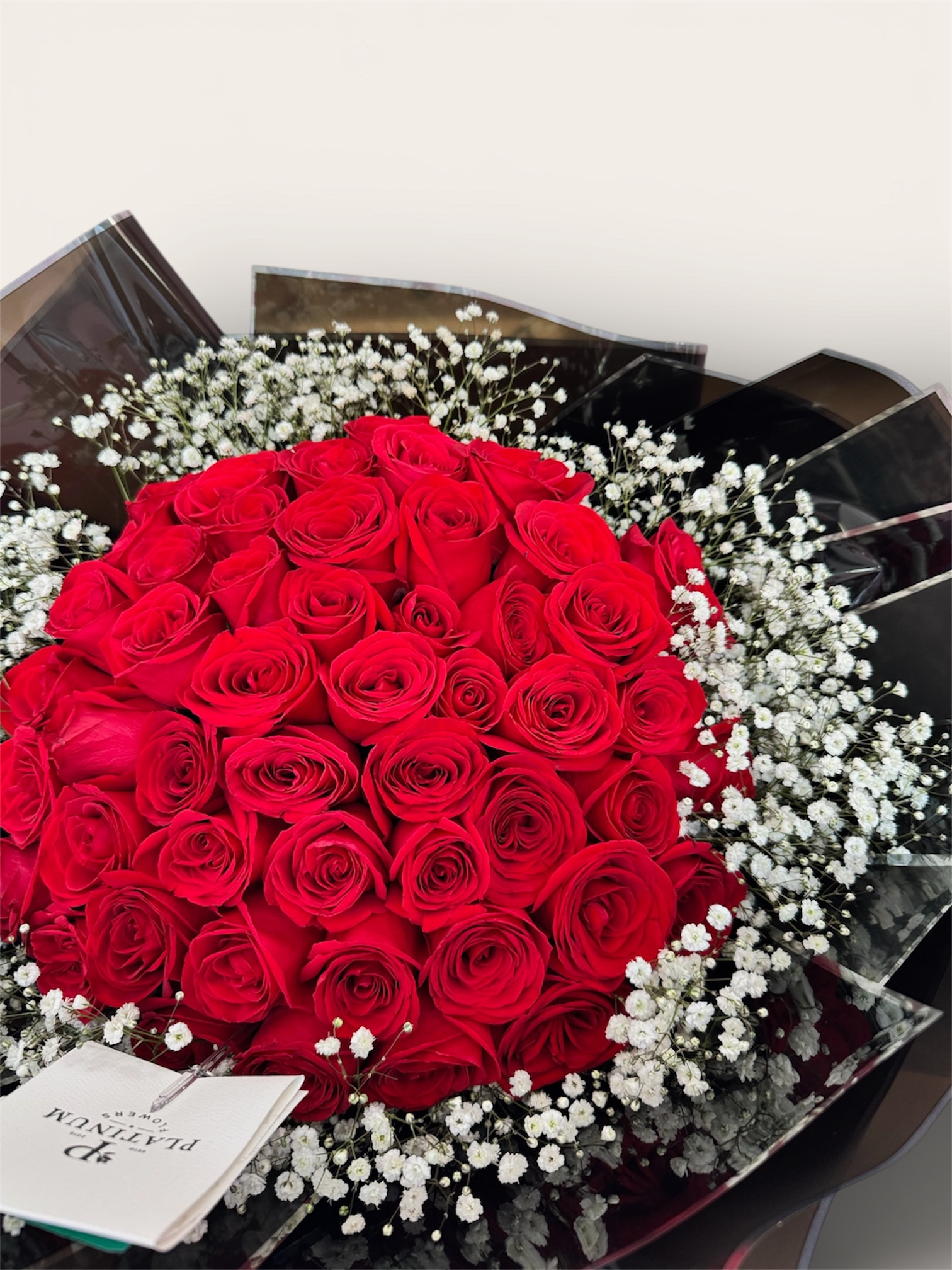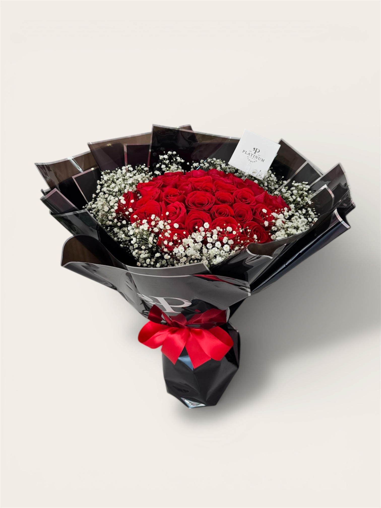 La combinación de rosas rojas con gypso aporta volumen y sofisticación, logrando un bouquet equilibrado con el sello distintivo de Platinum Flowers.