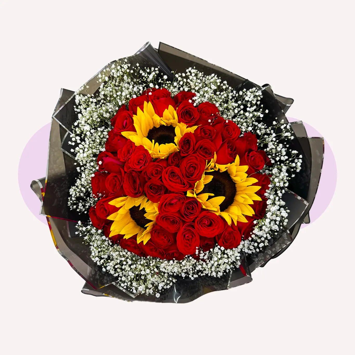 El bouquet 50 ROSAS ROJAS Y 3 GIRASOLES CON GYPSO es una combinación intensa y llamativa, ideal para sorprender con un diseño de alto impacto visual.