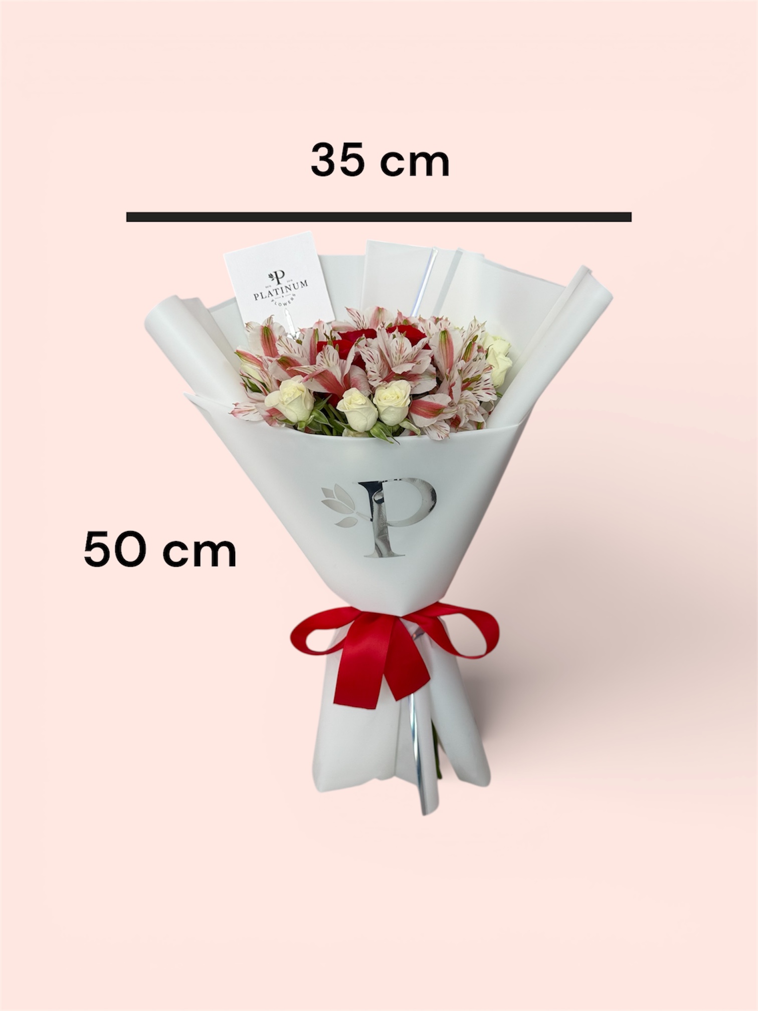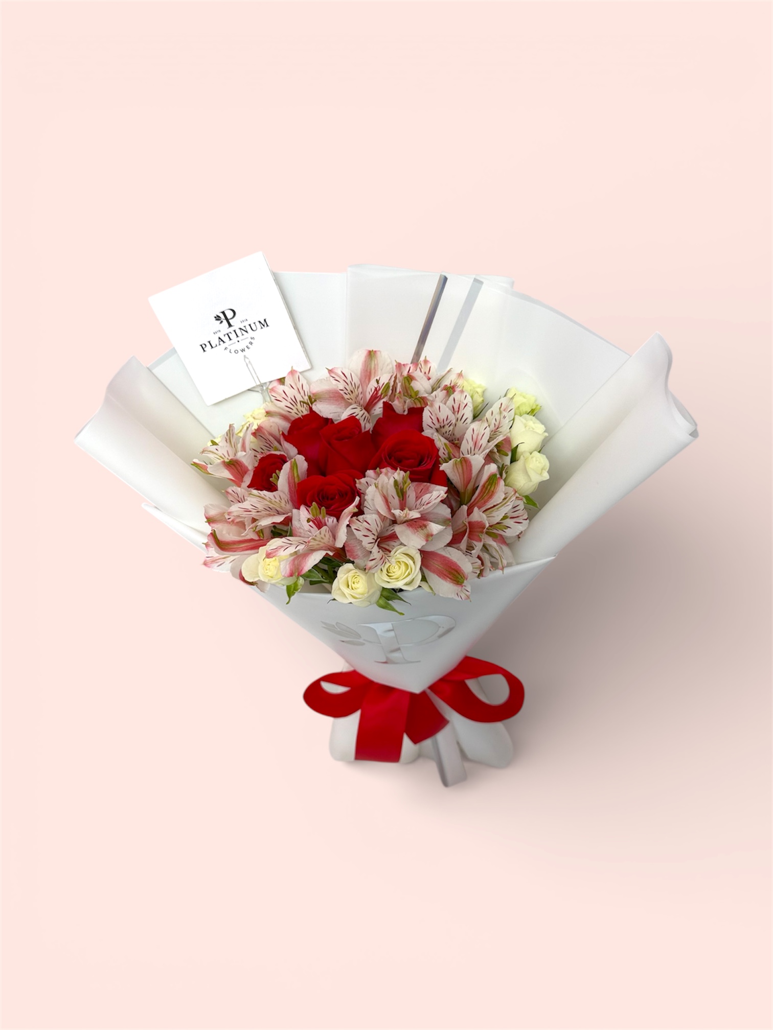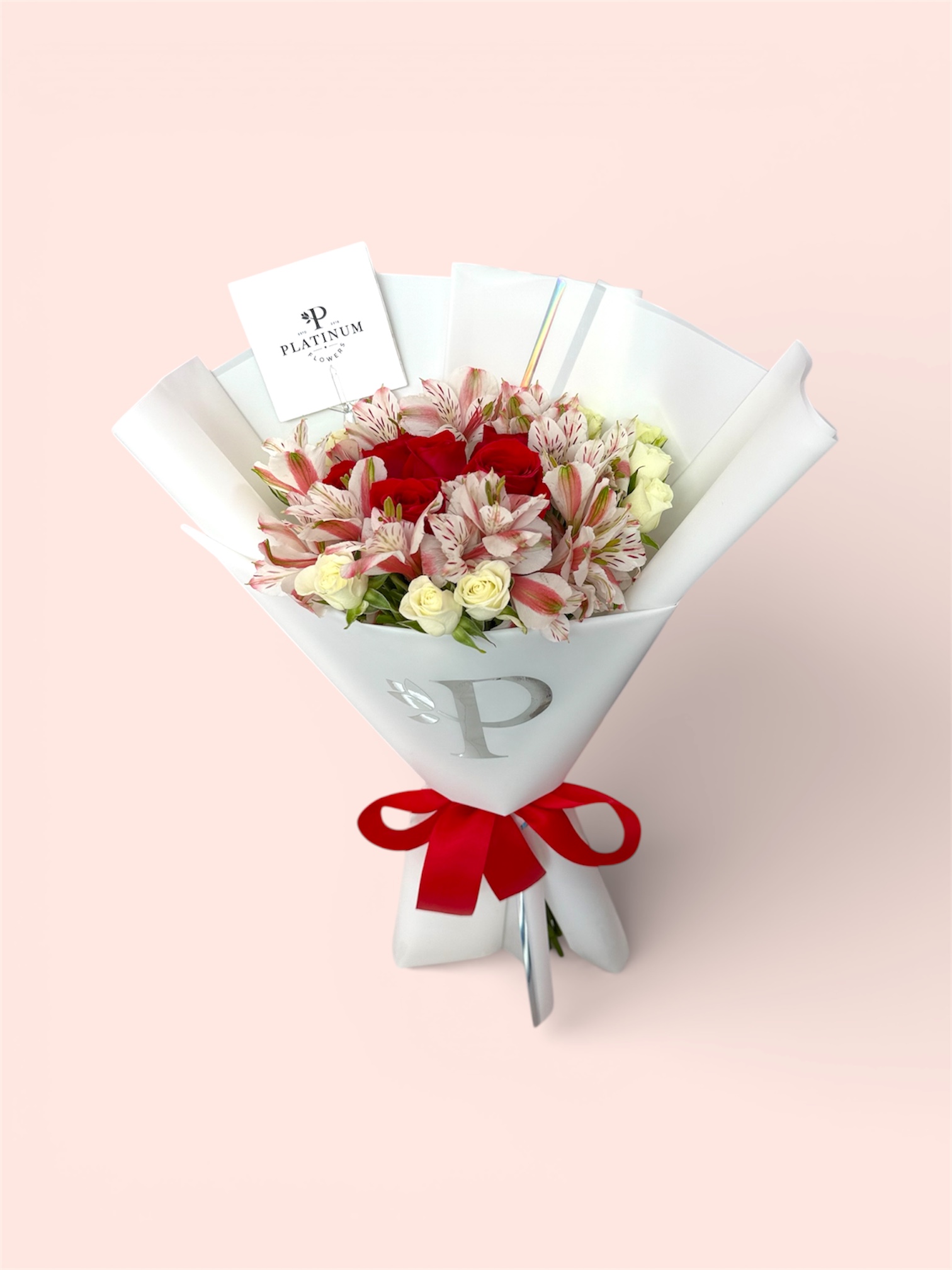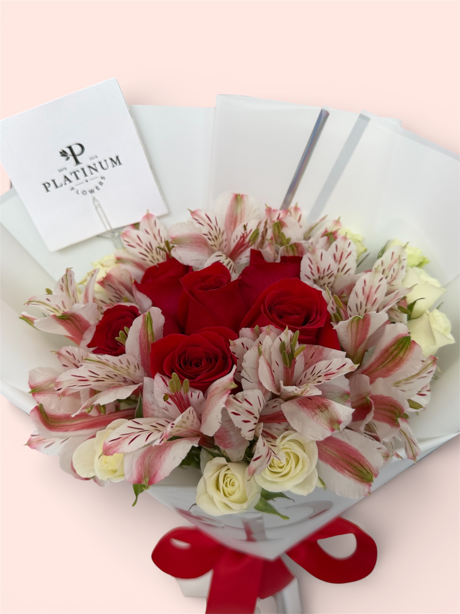 La combinación de rosas rojas con flores complementarias crea un diseño armonioso y llamativo, elaborado con el estilo característico de Platinum Flowers para causar una excelente impresión.