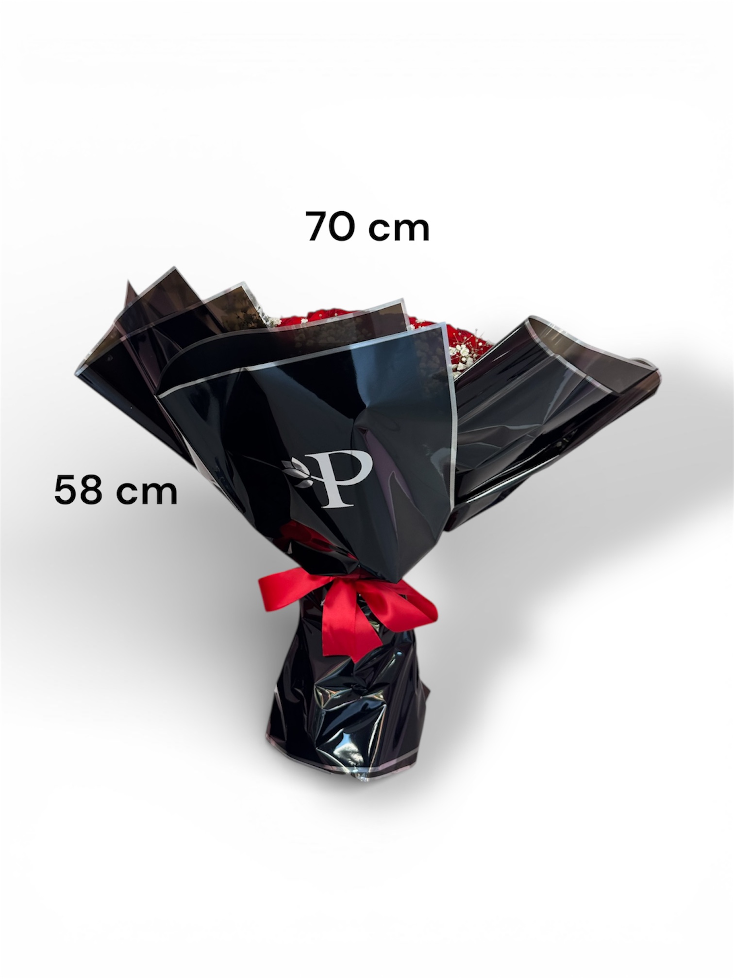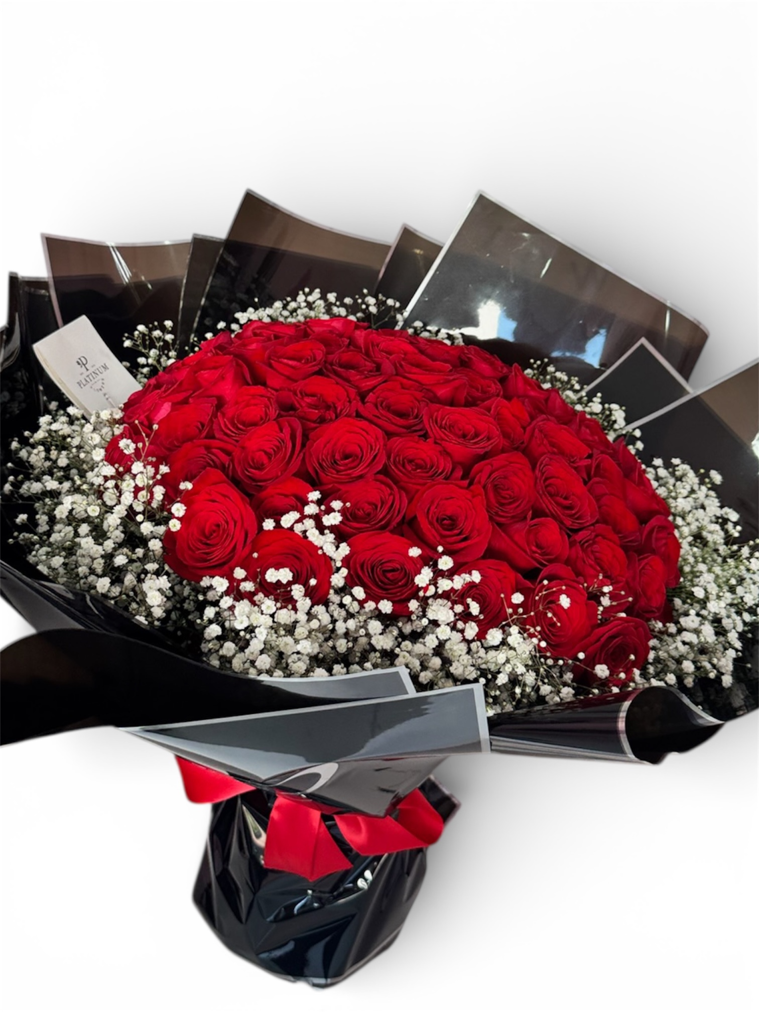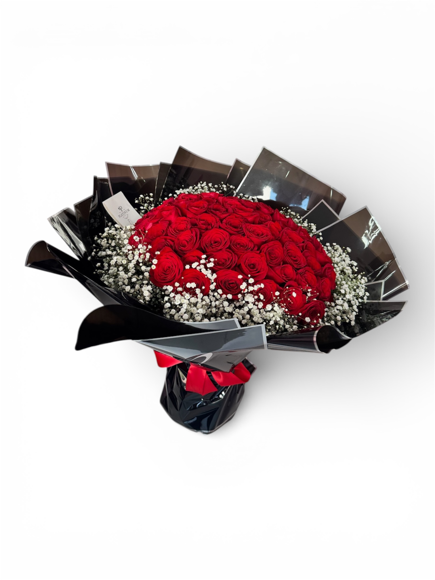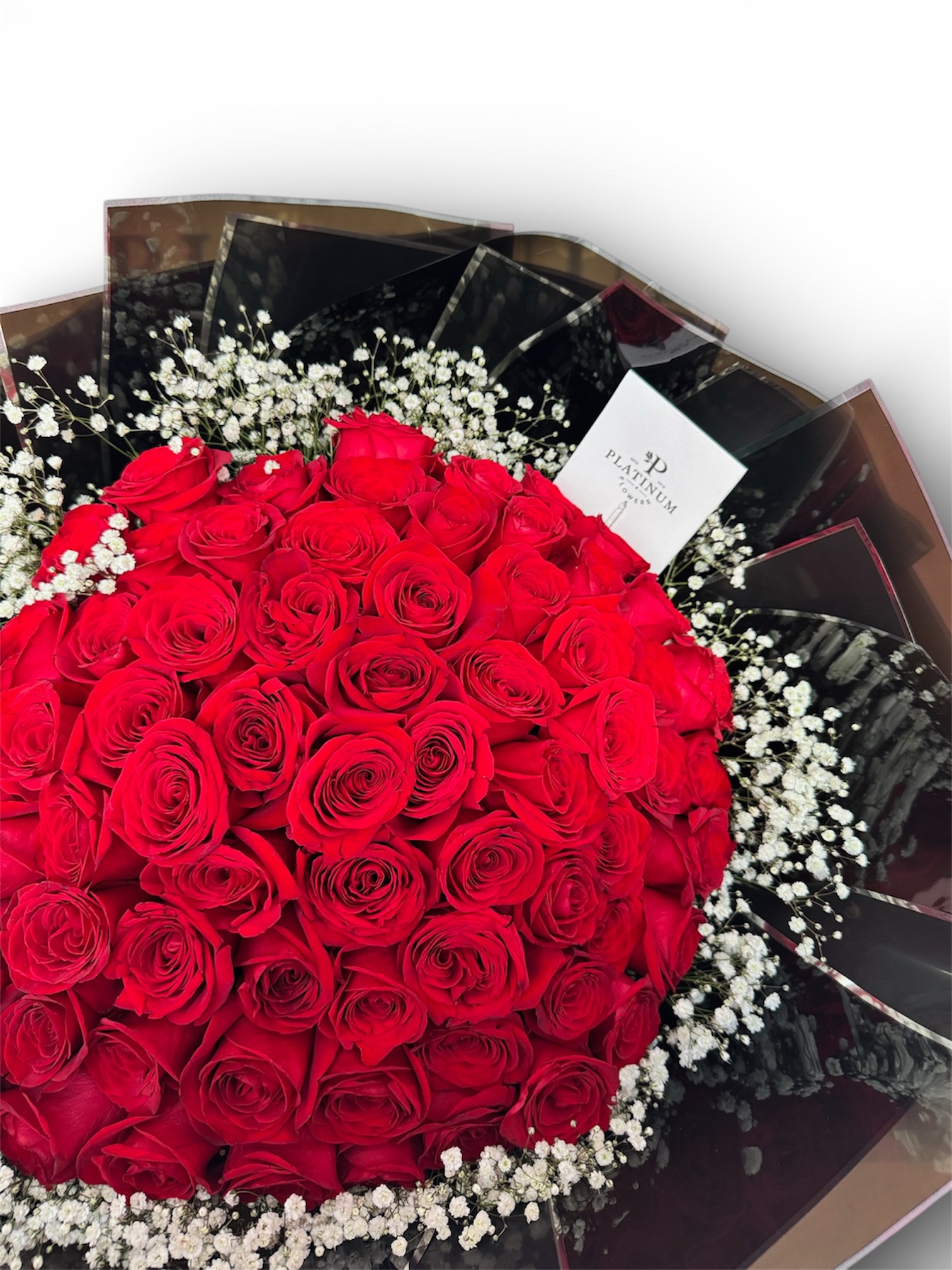 La combinación de rosas rojas con gypso aporta volumen y sofisticación, logrando un bouquet equilibrado y con gran presencia, elaborado con el estilo característico de Platinum Flowers.