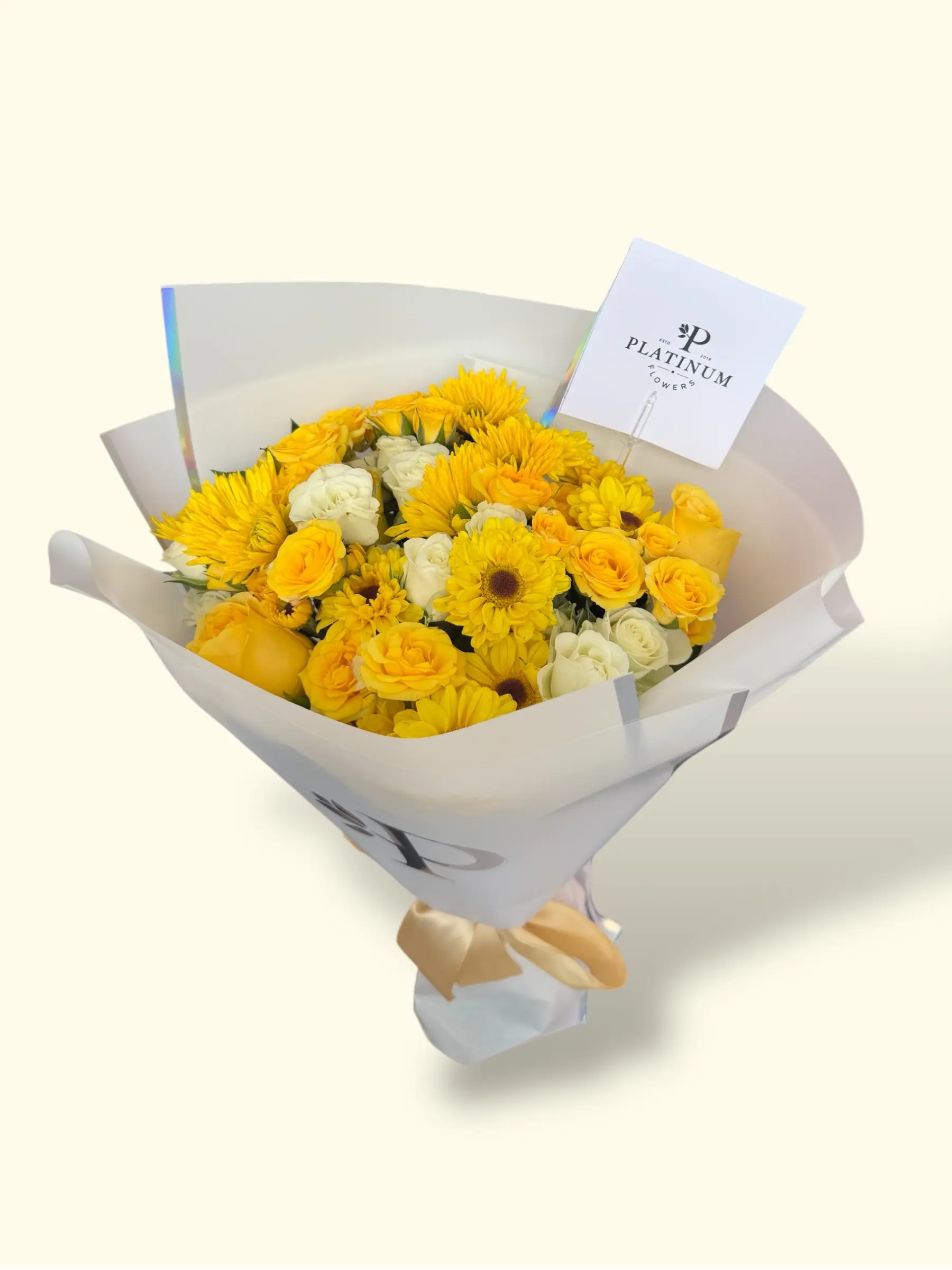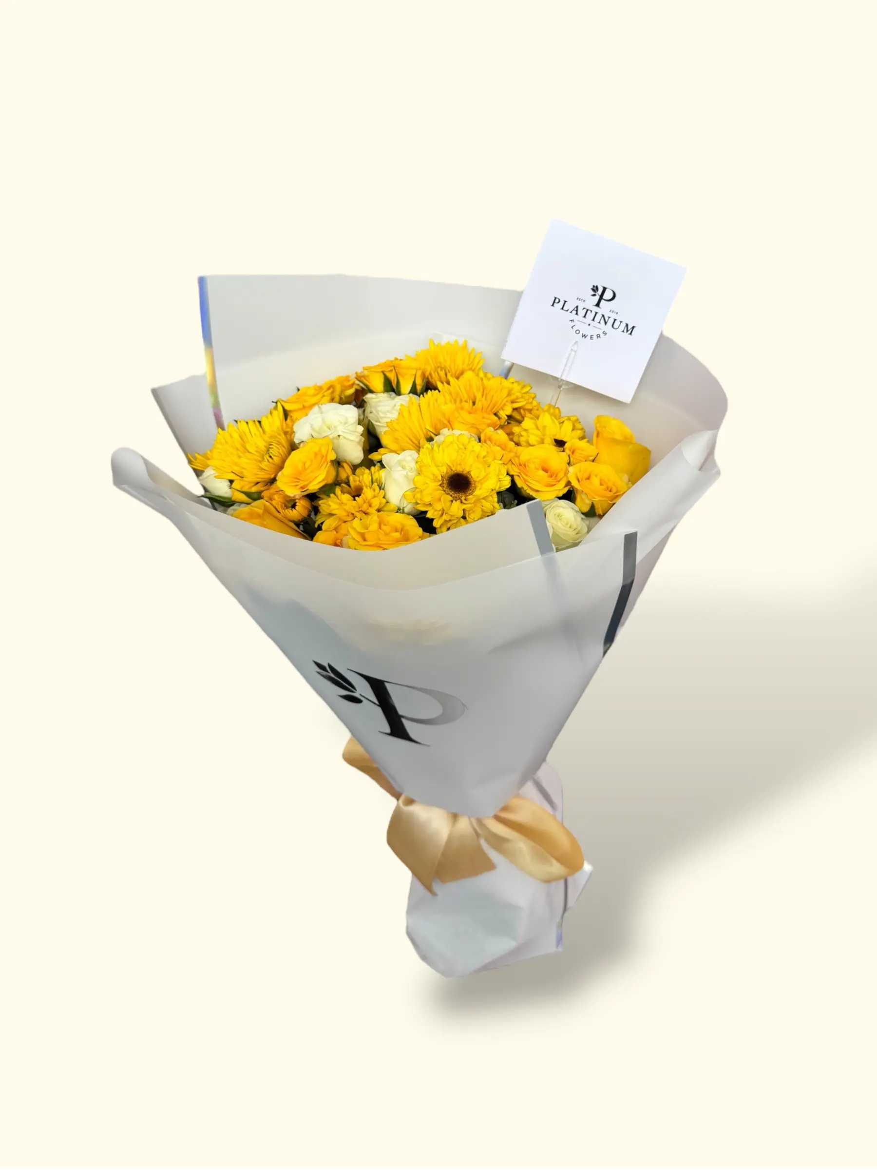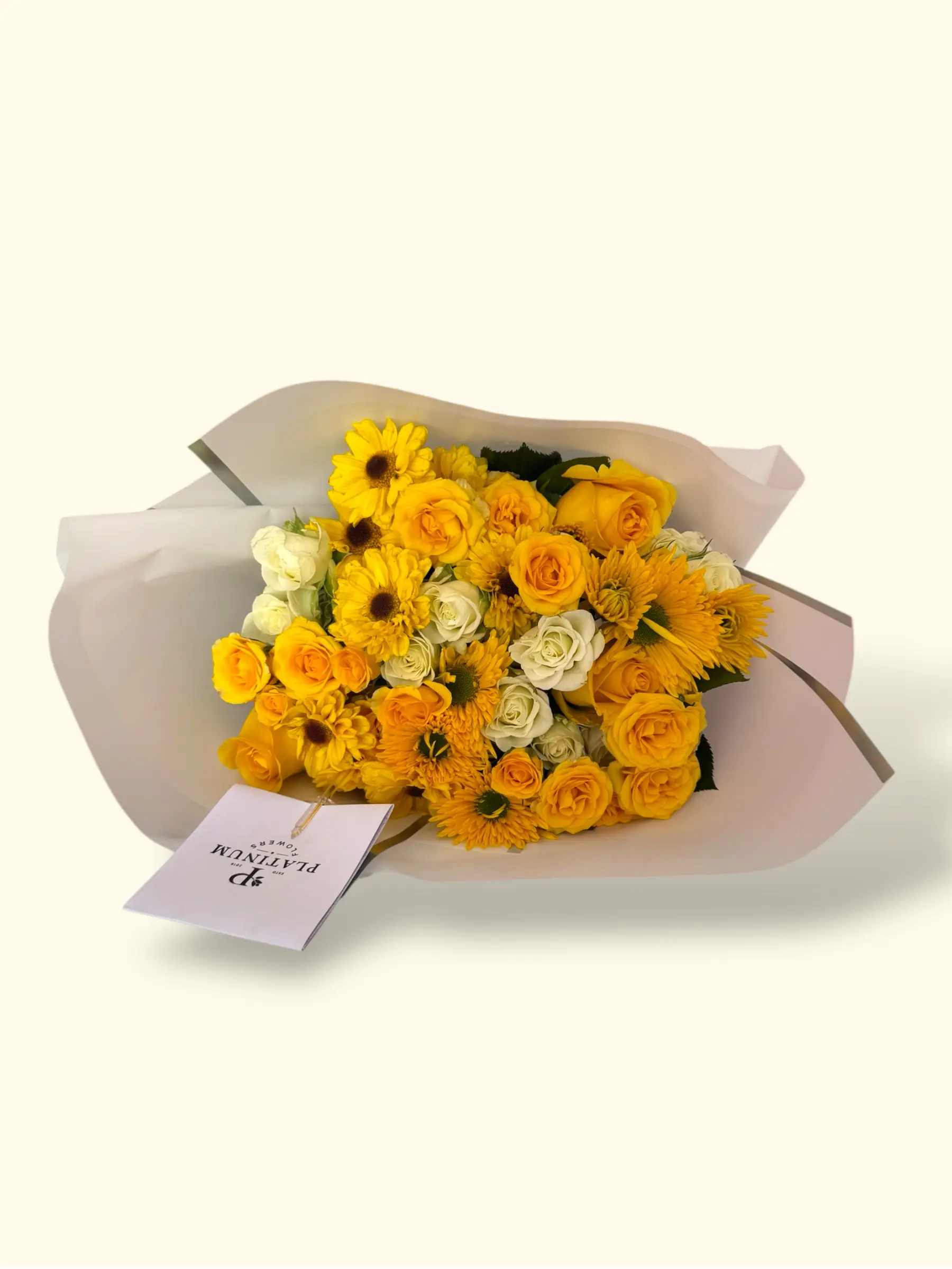 La combinación de solea con rosas y mini rosas crea un bouquet equilibrado y natural, con el estilo distintivo de Platinum Flowers.
