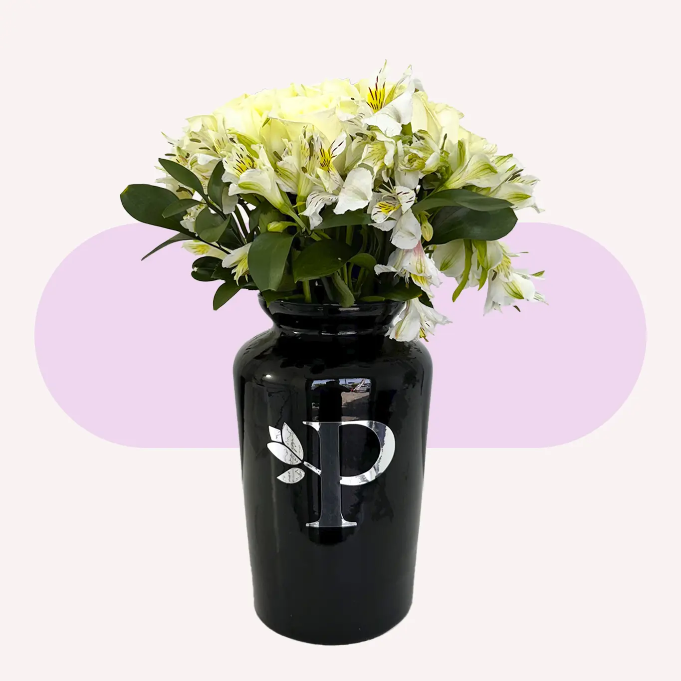 El jarrón JARRÓN DE ASTROMELIA Y ROSAS BLANCAS es un diseño sobrio y elegante, ideal para regalar un detalle floral limpio y refinado.