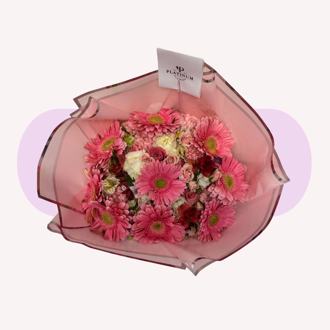 El bouquet MIX DE GERBERAS PLATINUM es un diseño colorido y elegante, ideal para regalar alegría con un toque premium.
