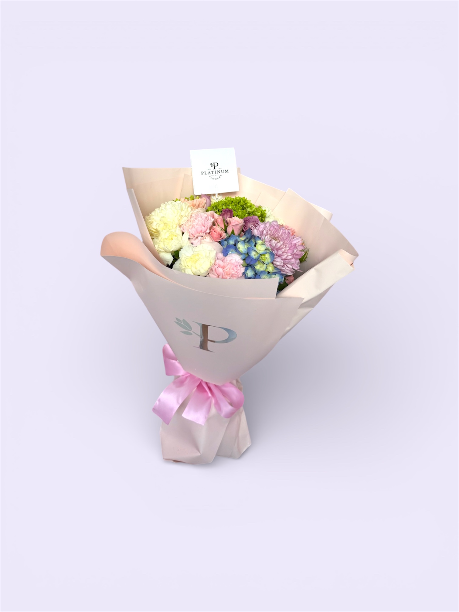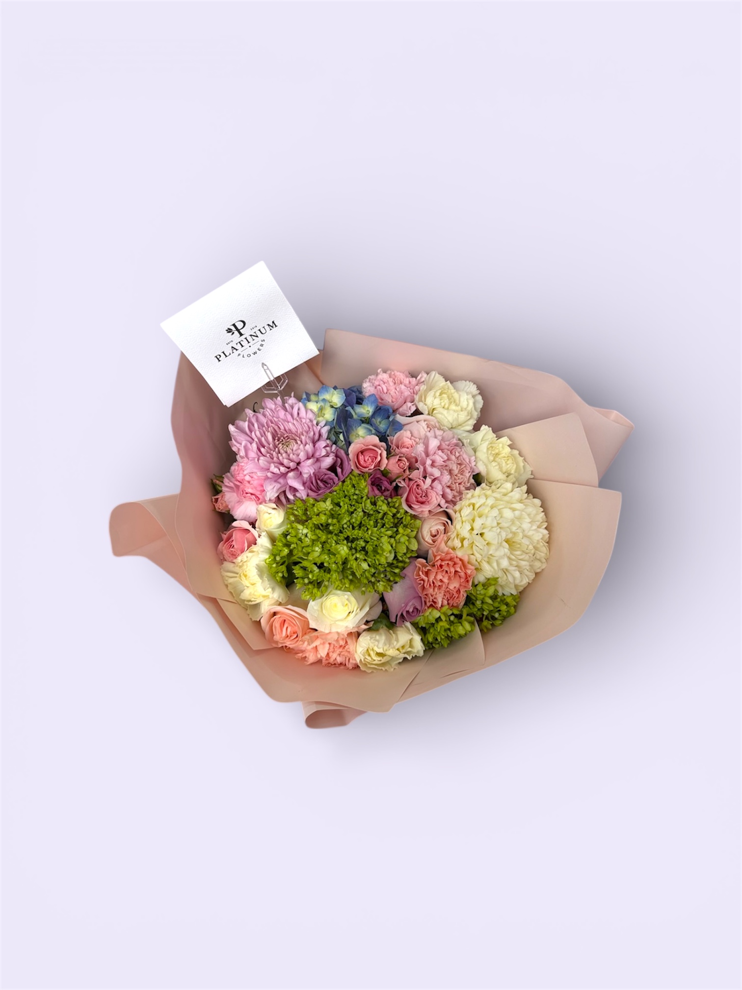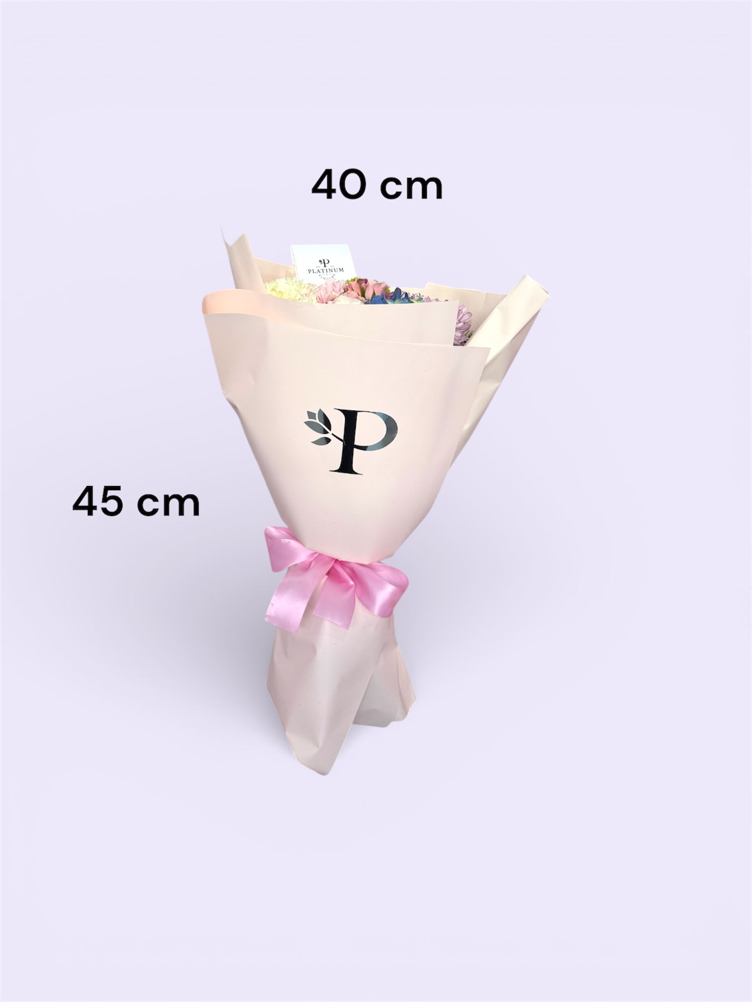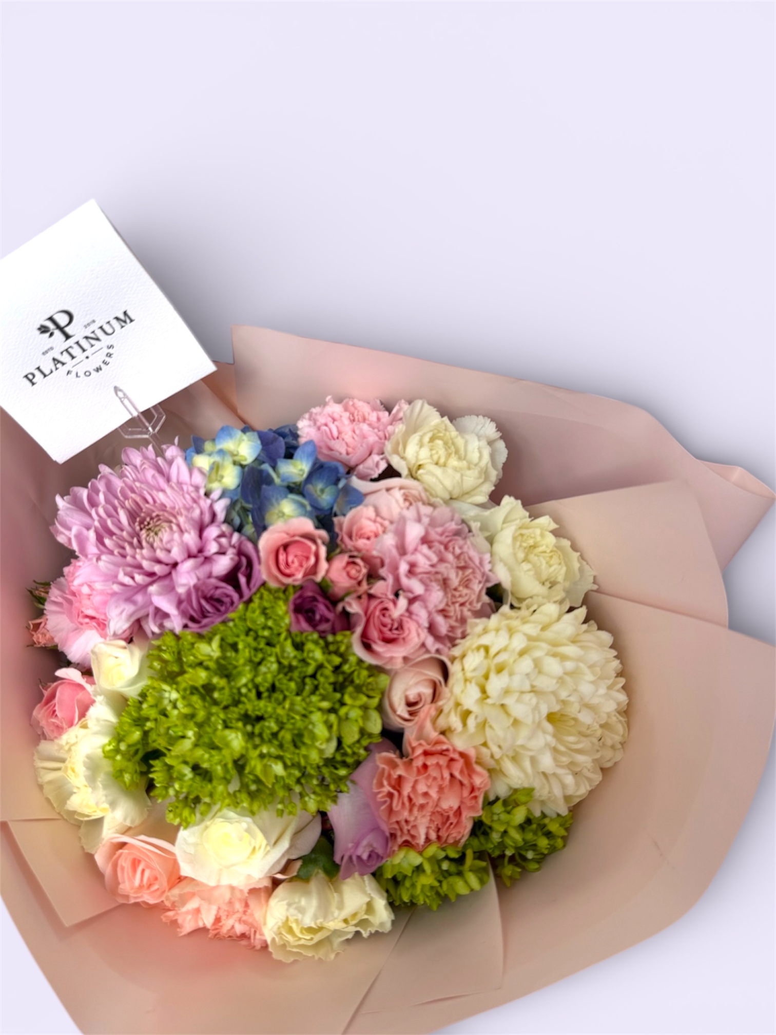 La combinación de flores crea un bouquet equilibrado y con gran presencia, elaborado con el estilo característico de Platinum Flowers.